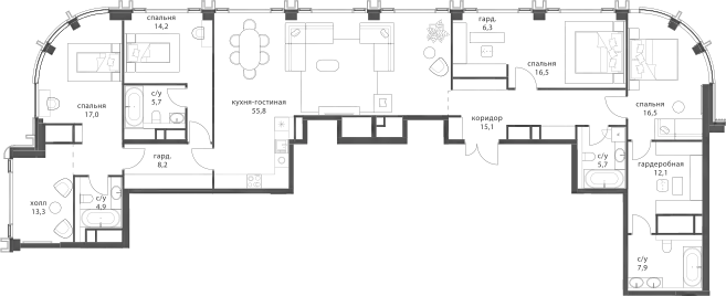 В комплексе предложен большой выбор элитных лотов: от функциональных однокомнатных квартир до семейных резиденций и пентхаусов со вторым светом. Есть и редкие форматы: с окнами в ванных, молированным угловым остеклением, возможностью установки камина. В квартирах спроектированы панорамные окна «в пол» и двухстворчатые двери. В более чем 50% квартир предусмотрены террасы, лоджии и балконы. Квартиры сдаются без отделки и внутренних перегородок.