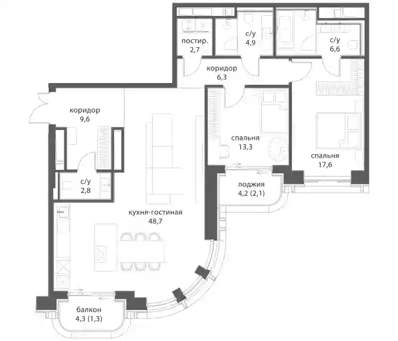 В комплексе предложен большой выбор элитных лотов: от функциональных однокомнатных квартир до семейных резиденций и пентхаусов со вторым светом. Есть и редкие форматы: с окнами в ванных, молированным угловым остеклением, возможностью установки камина. В квартирах спроектированы панорамные окна «в пол» и двухстворчатые двери. В более чем 50% квартир предусмотрены террасы, лоджии и балконы. Квартиры сдаются без отделки и внутренних перегородок.