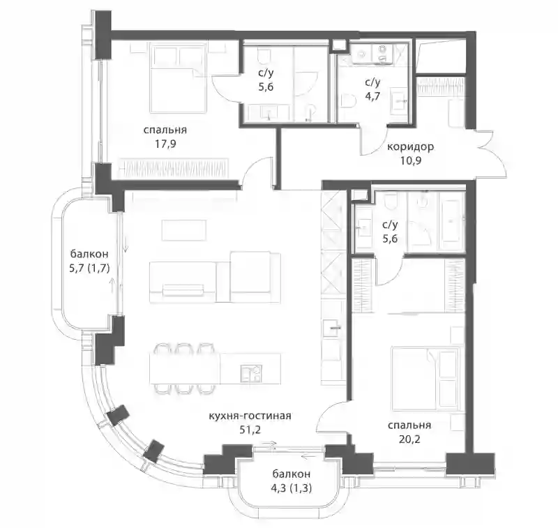 В комплексе предложен большой выбор элитных лотов: от функциональных однокомнатных квартир до семейных резиденций и пентхаусов со вторым светом. Есть и редкие форматы: с окнами в ванных, молированным угловым остеклением, возможностью установки камина. В квартирах спроектированы панорамные окна «в пол» и двухстворчатые двери. В более чем 50% квартир предусмотрены террасы, лоджии и балконы. Квартиры сдаются без отделки и внутренних перегородок.