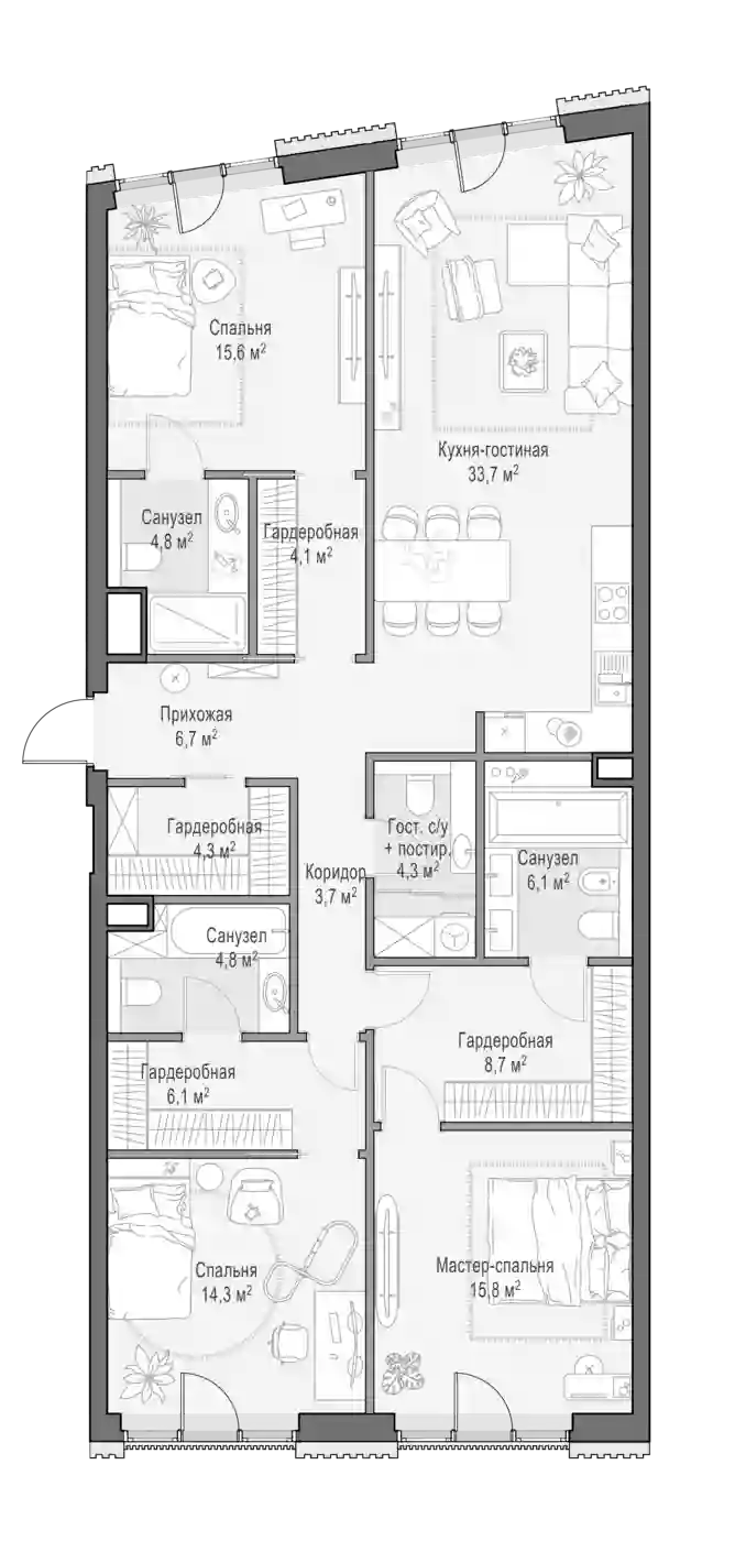 В квартале предложен широкий выбор квартир с увеличенной до 7,65 метра высотой потолков, пентхаусов с террасами, дровяными каминами и потолками высотой до 8,25 м. Есть варианты со вторым светом и возможностью обустройства второго этажа. В наличии квартиры High Level на предпоследнем этаже, с возможностью обустроить дровяной камин. Есть квартиры с террасами в уровень этажа, лоты с панорамными окнами, индивидуальными балконами и моллированным остеклением. Все квартиры сдаются без отделки.