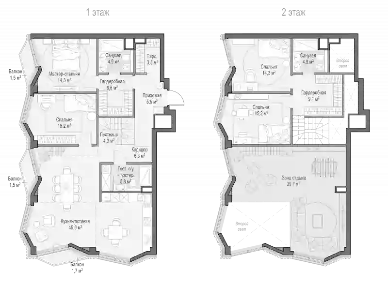 В квартале предложен широкий выбор квартир с увеличенной до 7,65 метра высотой потолков, пентхаусов с террасами, дровяными каминами и потолками высотой до 8,25 м. Есть варианты со вторым светом и возможностью обустройства второго этажа. В наличии квартиры High Level на предпоследнем этаже, с возможностью обустроить дровяной камин. Есть квартиры с террасами в уровень этажа, лоты с панорамными окнами, индивидуальными балконами и моллированным остеклением. Все квартиры сдаются без отделки.