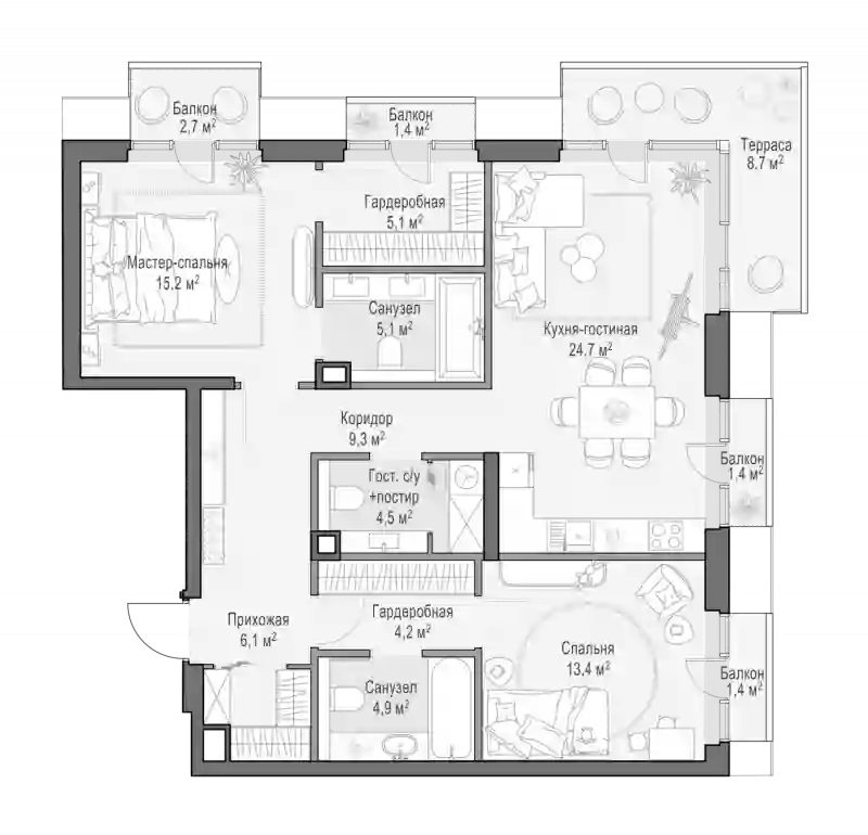 В квартале предложен широкий выбор квартир с увеличенной до 7,65 метра высотой потолков, пентхаусов с террасами, дровяными каминами и потолками высотой до 8,25 м. Есть варианты со вторым светом и возможностью обустройства второго этажа. В наличии квартиры High Level на предпоследнем этаже, с возможностью обустроить дровяной камин. Есть квартиры с террасами в уровень этажа, лоты с панорамными окнами, индивидуальными балконами и моллированным остеклением. Все квартиры сдаются без отделки.