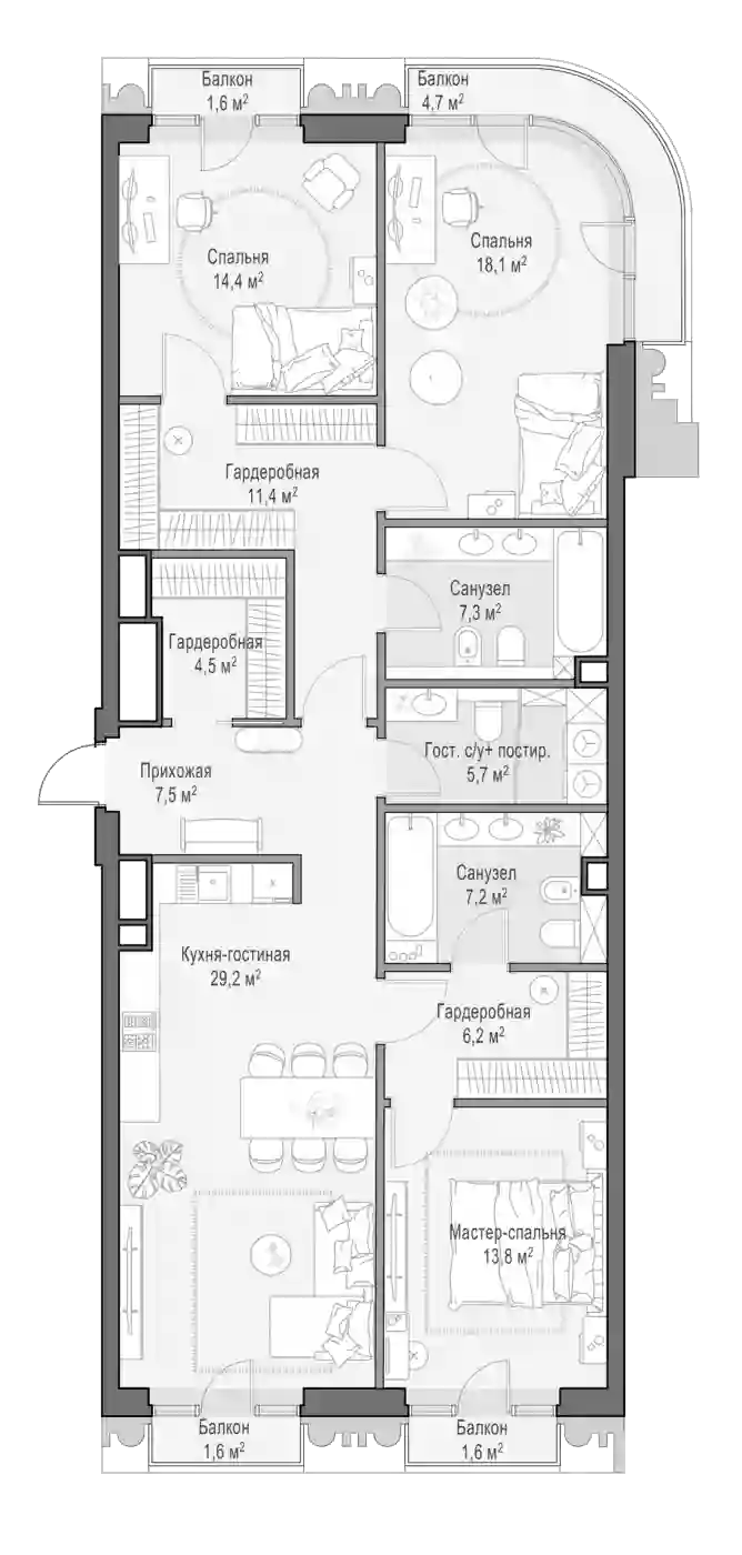 В квартале предложен широкий выбор квартир с увеличенной до 7,65 метра высотой потолков, пентхаусов с террасами, дровяными каминами и потолками высотой до 8,25 м. Есть варианты со вторым светом и возможностью обустройства второго этажа. В наличии квартиры High Level на предпоследнем этаже, с возможностью обустроить дровяной камин. Есть квартиры с террасами в уровень этажа, лоты с панорамными окнами, индивидуальными балконами и моллированным остеклением. Все квартиры сдаются без отделки.