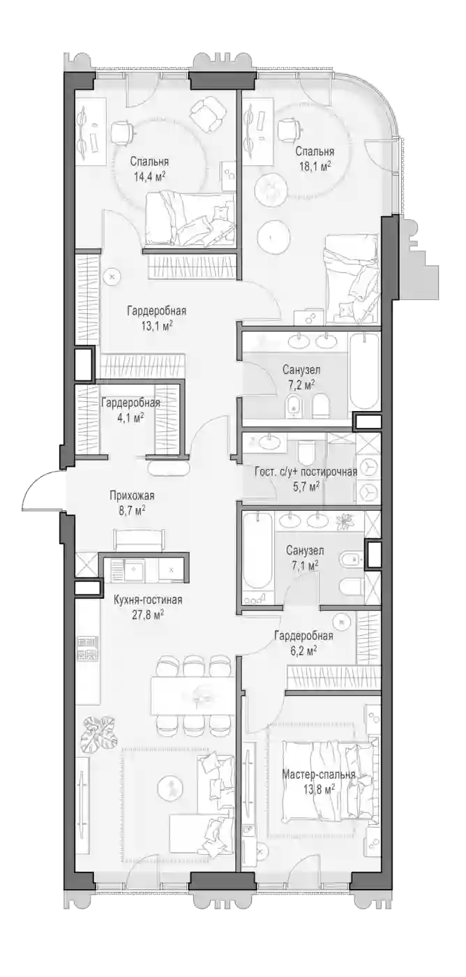 В квартале предложен широкий выбор квартир с увеличенной до 7,65 метра высотой потолков, пентхаусов с террасами, дровяными каминами и потолками высотой до 8,25 м. Есть варианты со вторым светом и возможностью обустройства второго этажа. В наличии квартиры High Level на предпоследнем этаже, с возможностью обустроить дровяной камин. Есть квартиры с террасами в уровень этажа, лоты с панорамными окнами, индивидуальными балконами и моллированным остеклением. Все квартиры сдаются без отделки.