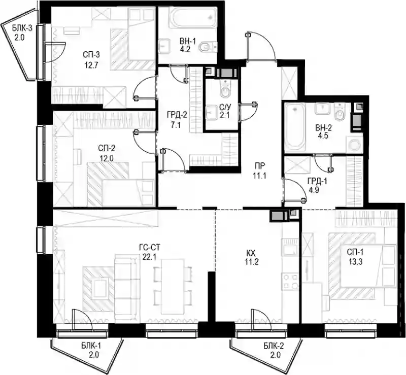 В проекте предлагаются квартиры с 1–4 комнатами. Все помещения оснащены увеличенными окнами, а в некоторых предусмотрены эркеры. На верхних этажах, начиная с 20-го или 23-го в зависимости от корпуса, расположены квартиры с видом на панораму города. В ряде планировок спроектированы мастер-спальни и гардеробные. Высота потолков достигает 3–3,65 м. Квартиры передаются без внутренних перегородок, что позволяет владельцам свободно организовать пространство.