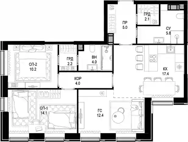 В проекте предлагаются квартиры с 1–4 комнатами. Все помещения оснащены увеличенными окнами, а в некоторых предусмотрены эркеры. На верхних этажах, начиная с 20-го или 23-го в зависимости от корпуса, расположены квартиры с видом на панораму города. В ряде планировок спроектированы мастер-спальни и гардеробные. Высота потолков достигает 3–3,65 м. Квартиры передаются без внутренних перегородок, что позволяет владельцам свободно организовать пространство.