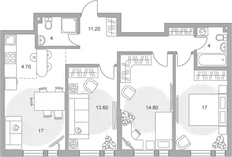В проекте предлагаются студии и квартиры с 1–4 комнатами, в том числе планировки евроформата с кухней-гостиной. Площади варьируются от 18,7 до 73,8 кв. м. В помещениях установлены увеличенные окна, что обеспечивает хорошую инсоляцию. Высота потолков составляет 2,7 м в квартирах с отделкой. Жилье передается без отделки или в предчистовом варианте, что предполагает подготовку стен, пола и потолка под финишное покрытие, а также разводку инженерных коммуникаций. В ряде планировок спроектированы лоджии и отдельные гардеробные комнаты. Доступна отделка под ключ, благодаря чему владельцы могут получить готовую квартиру без дополнительных затрат на ремонт.