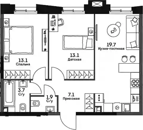 3-к.квартира, 58.6 м², 21 эт. в ЖК Twelve Корпус 2
