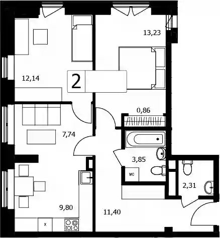 3-к.квартира, 61.33 м², 2 эт. в ЖК Twice Корпус 1