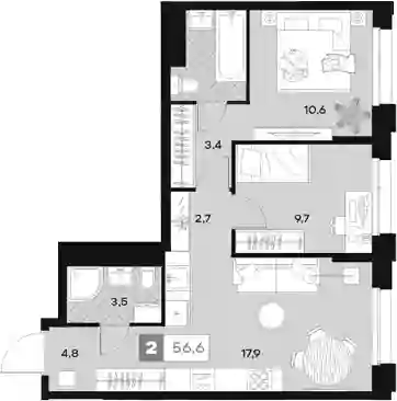 2-к.квартира, 56.6 м², 19 эт. в ЖК U2 Корпус С1