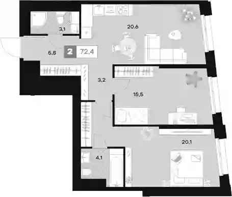 2-к.квартира, 72.4 м², 20 эт. в ЖК U2 Корпус С2