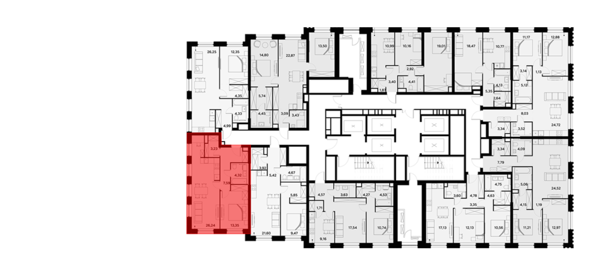 В проекте представлены квартиры с 1–4 комнатами, включая европланировки, двухуровневые форматы, варианты с террасами, лоджиями, а также опции с мастер-спальнями и гардеробными. В помещениях установлены увеличенные или панорамные окна, а высота потолков варьируется от 2,85 до 3,1 м. Из некоторых квартир открываются виды на Москву-реку. Также, для дополнительного комфорта жильцов, предусмотрены системы умного дома и климат-контроля.