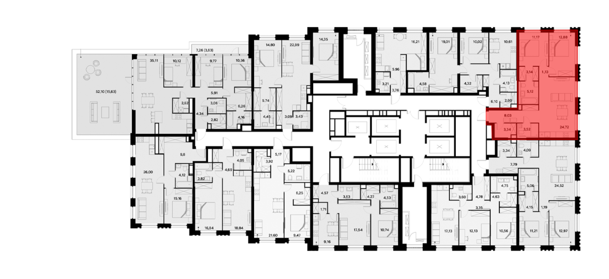 В проекте представлены квартиры с 1–4 комнатами, включая европланировки, двухуровневые форматы, варианты с террасами, лоджиями, а также опции с мастер-спальнями и гардеробными. В помещениях установлены увеличенные или панорамные окна, а высота потолков варьируется от 2,85 до 3,1 м. Из некоторых квартир открываются виды на Москву-реку. Также, для дополнительного комфорта жильцов, предусмотрены системы умного дома и климат-контроля.