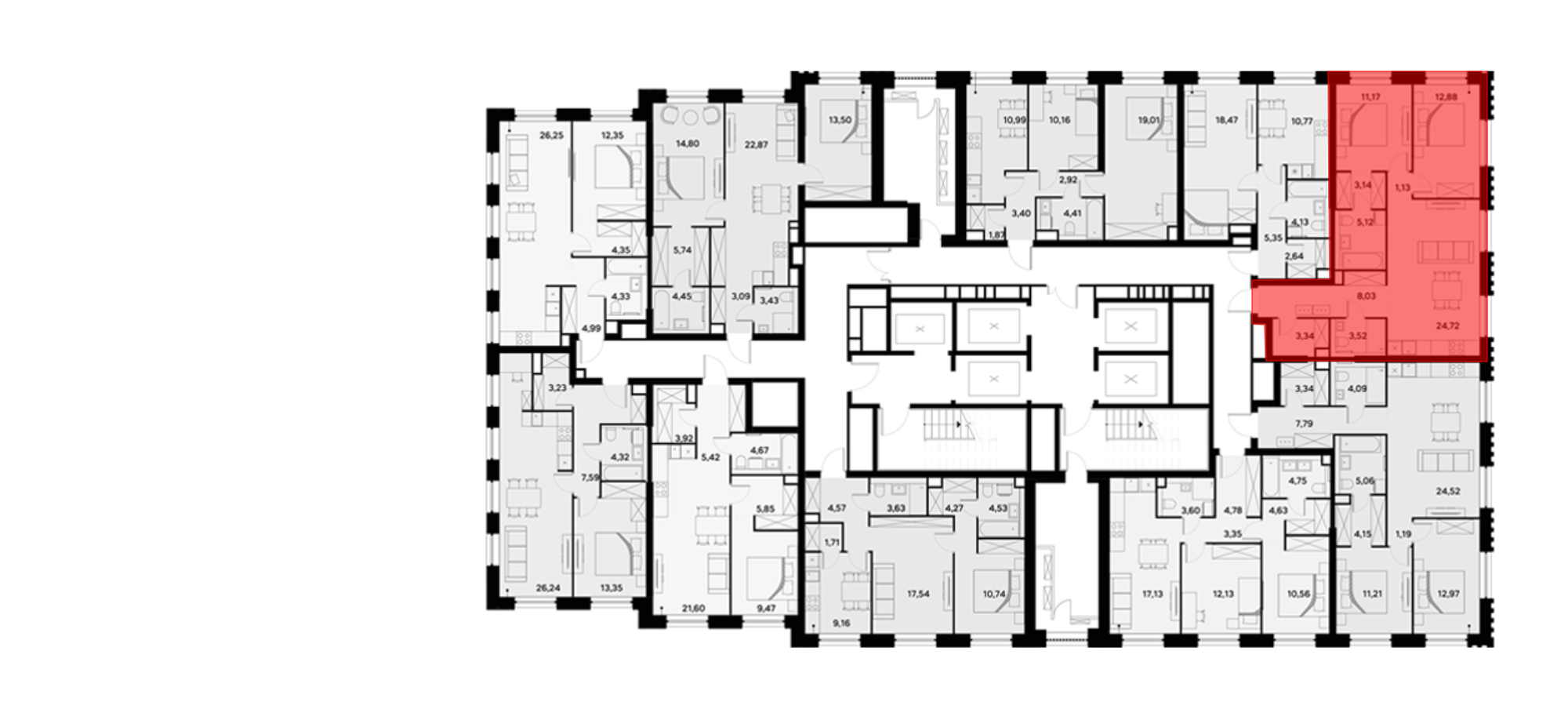 В проекте представлены квартиры с 1–4 комнатами, включая европланировки, двухуровневые форматы, варианты с террасами, лоджиями, а также опции с мастер-спальнями и гардеробными. В помещениях установлены увеличенные или панорамные окна, а высота потолков варьируется от 2,85 до 3,1 м. Из некоторых квартир открываются виды на Москву-реку. Также, для дополнительного комфорта жильцов, предусмотрены системы умного дома и климат-контроля.