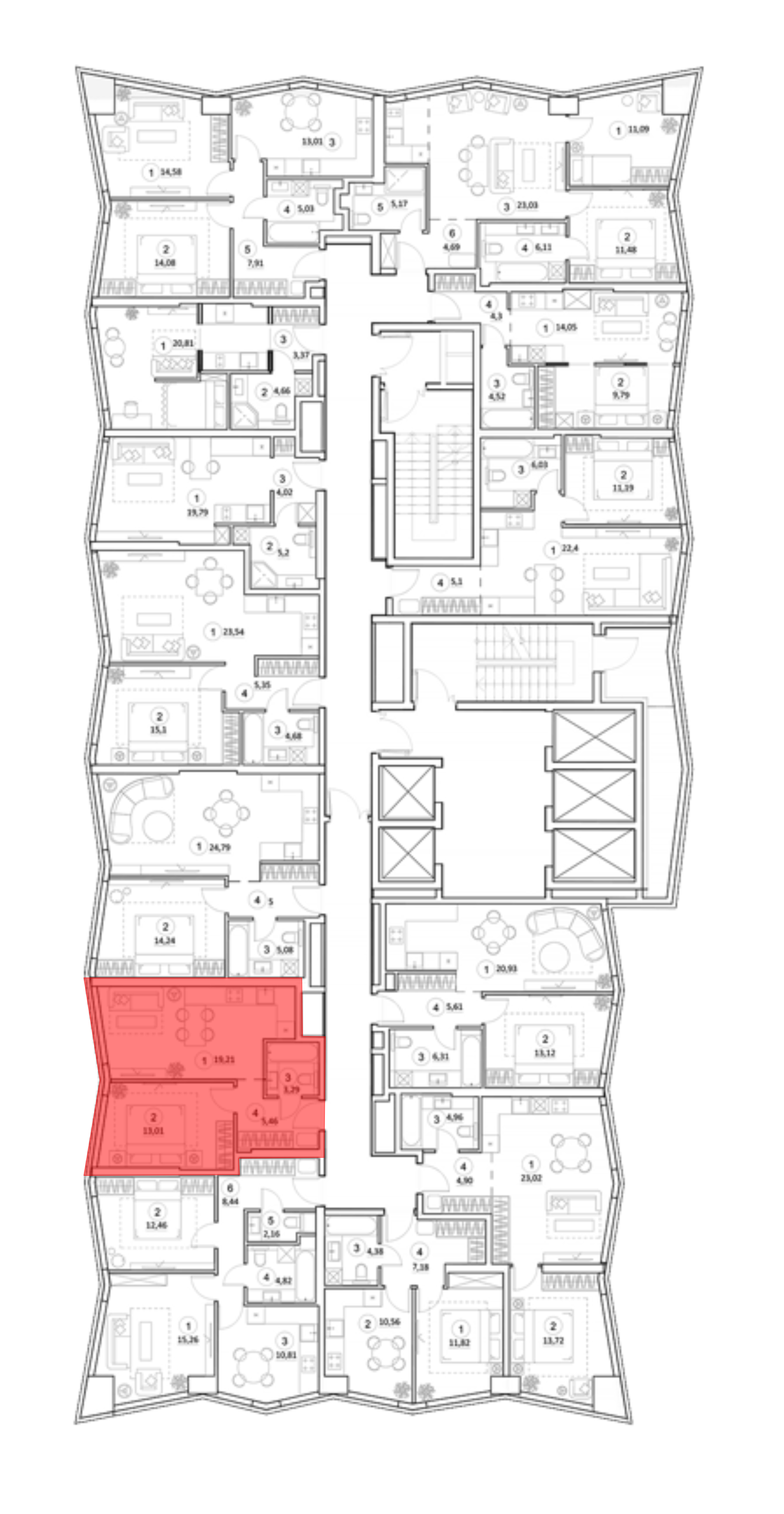 В жилом комплексе представлен широкий выбор планировочных решений — от уютных студий площадью от 28 кв. м до просторных квартир с 4 спальнями площадью 95 кв. м, включая эргономичные евроформаты. В помещениях установлены панорамные окна, высота потолков варьируется от 2,85 до 3,4 метров. Квартиры идут без стен, что дает владельцам возможность реализовать индивидуальные дизайнерские решения.