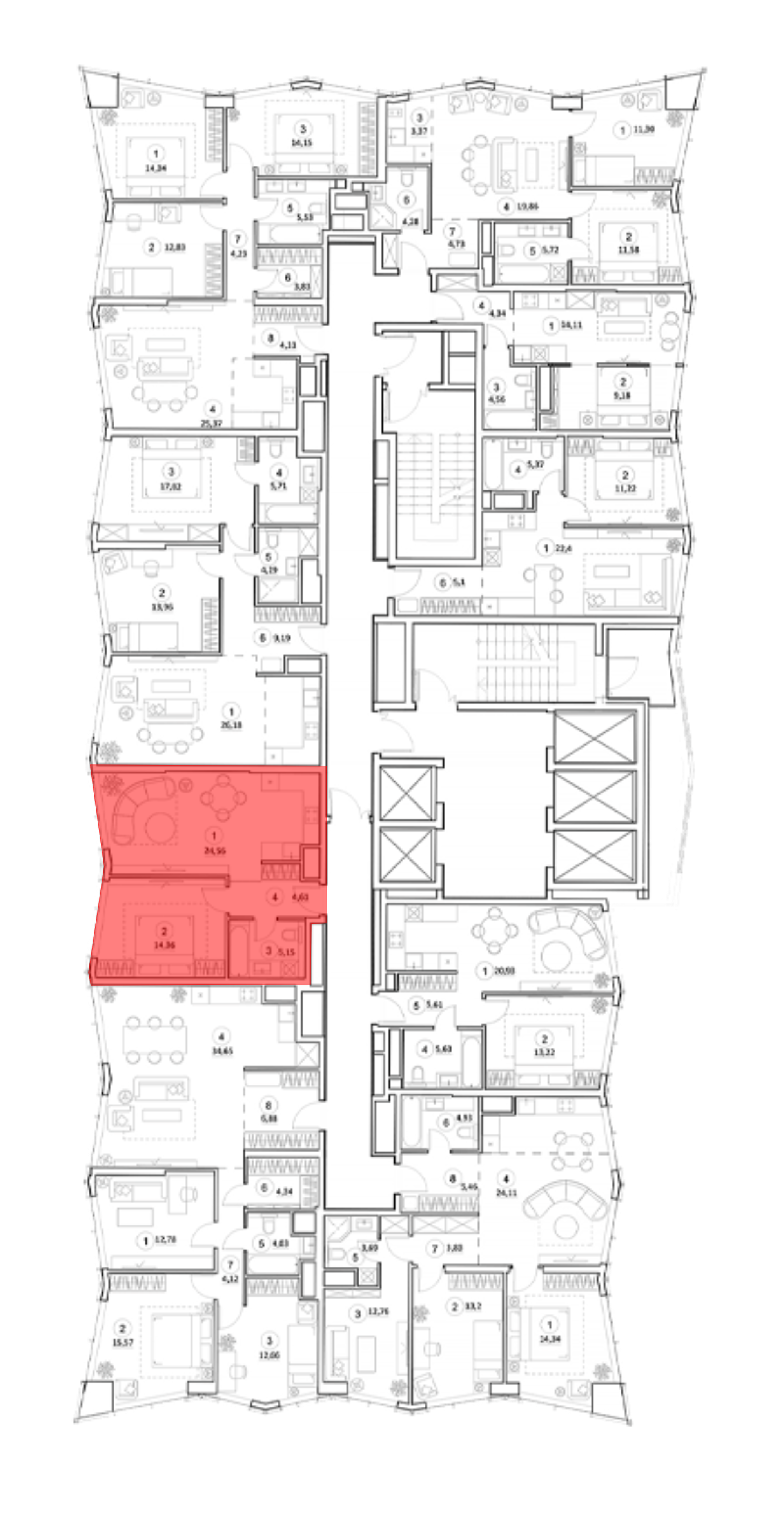 В жилом комплексе представлен широкий выбор планировочных решений — от уютных студий площадью от 28 кв. м до просторных квартир с 4 спальнями площадью 95 кв. м, включая эргономичные евроформаты. В помещениях установлены панорамные окна, высота потолков варьируется от 2,85 до 3,4 метров. Квартиры идут без стен, что дает владельцам возможность реализовать индивидуальные дизайнерские решения.