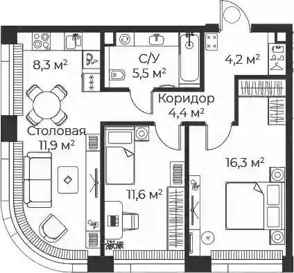 В комплексе предложен широкий выбор планировочных решений: от компактных студий площадью 22 кв. метра до просторных резиденций площадью 120 кв. метров. Планировками предусмотрены мастер-спальни с гардеробной и санузлом, просторные кухни-гостиные, гардеробные и системы хранения, выделенные рабочие зоны в спальнях и террасы с панорамным видом на город. Во всех квартирах панорамные окна и высокие потолки от 2,85 метра. Квартиры сдаются с отделкой White box.