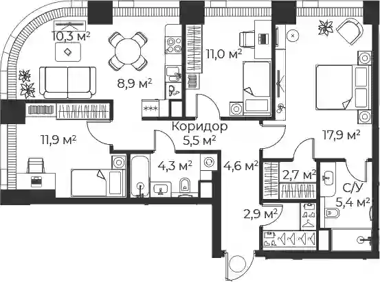 В комплексе предложено множество планировочных решений: в наличии квартиры, как классического типа, так и европланировки. Квартиры сдаются с подчистовой отделкой, высотой потолков 3 м и панорамным остеклением в пол.