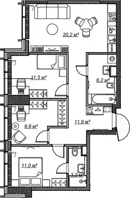 Квартиры в ЖК представлены классическими планировками от студий до трёхкомнатных. Есть возможность выбрать квартиру без отделки, с подчистовой и чистовой отделкой.
