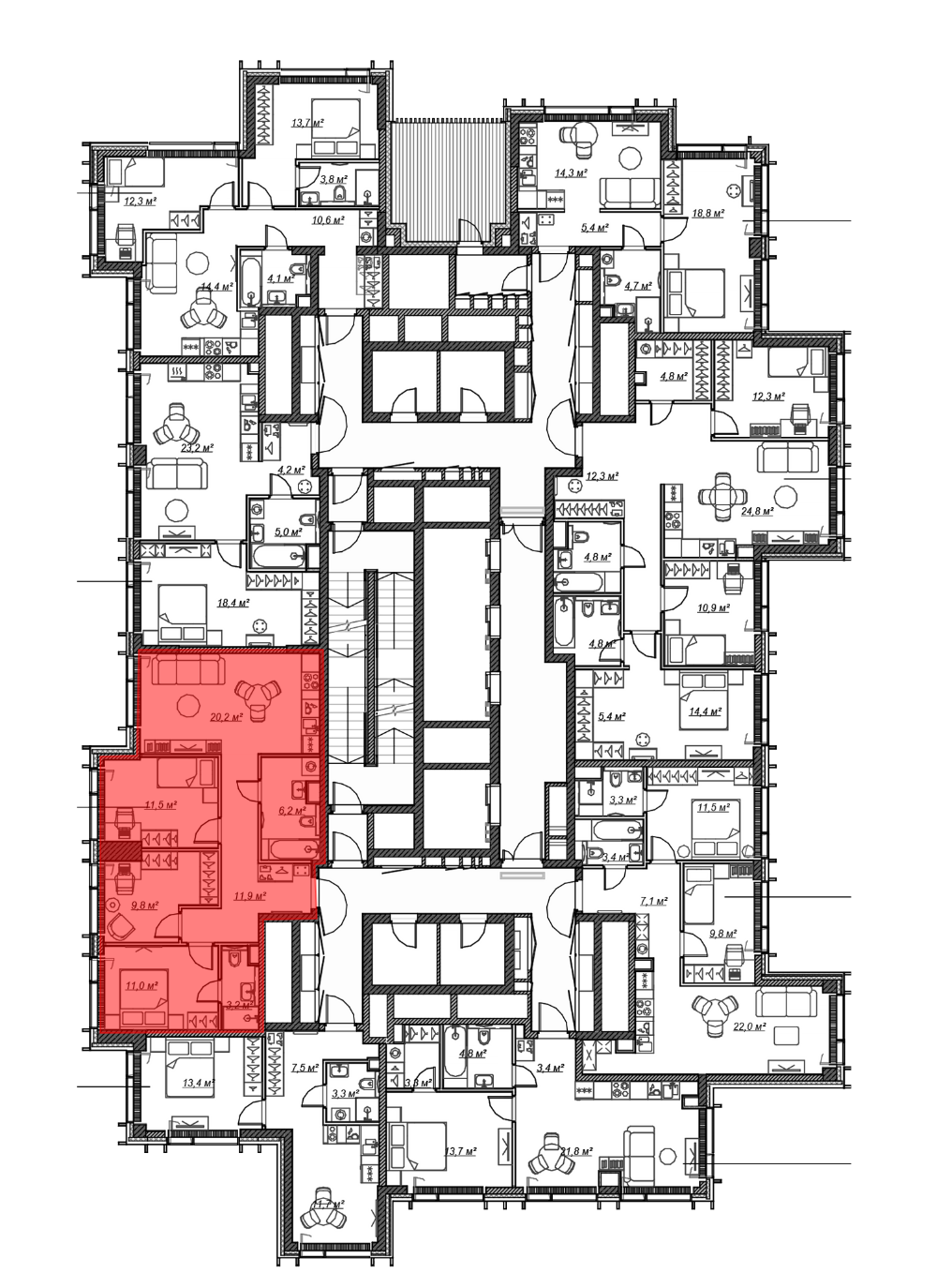 В комплексе предложен широкий выбор планировочных решений: от компактных студий площадью 22 кв. метра до просторных резиденций площадью 120 кв. метров. Планировками предусмотрены мастер-спальни с гардеробной и санузлом, просторные кухни-гостиные, гардеробные и системы хранения, выделенные рабочие зоны в спальнях и террасы с панорамным видом на город. Во всех квартирах панорамные окна и высокие потолки от 2,85 метра. Квартиры сдаются с отделкой White box.