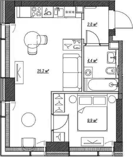 В комплексе предложен широкий выбор планировочных решений: от компактных студий площадью 22 кв. метра до просторных резиденций площадью 120 кв. метров. Планировками предусмотрены мастер-спальни с гардеробной и санузлом, просторные кухни-гостиные, гардеробные и системы хранения, выделенные рабочие зоны в спальнях и террасы с панорамным видом на город. Во всех квартирах панорамные окна и высокие потолки от 2,85 метра. Квартиры сдаются с отделкой White box.