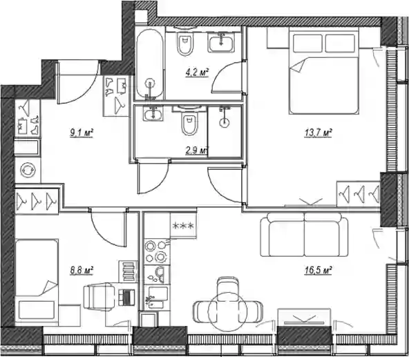 Квартиры в ЖК представлены классическими планировками от студий до трёхкомнатных. Есть возможность выбрать квартиру без отделки, с подчистовой и чистовой отделкой.