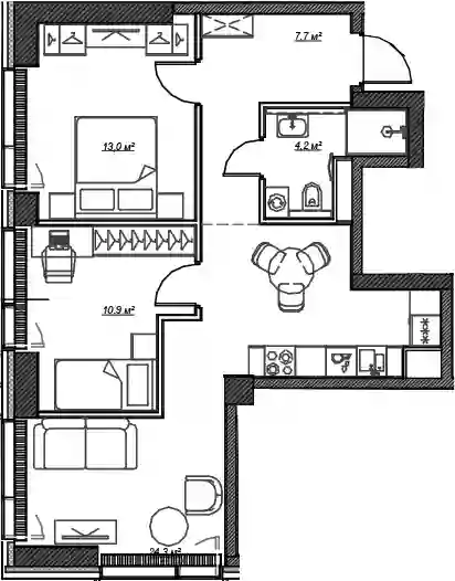 В комплексе предложен широкий выбор планировочных решений: от компактных студий площадью 22 кв. метра до просторных резиденций площадью 120 кв. метров. Планировками предусмотрены мастер-спальни с гардеробной и санузлом, просторные кухни-гостиные, гардеробные и системы хранения, выделенные рабочие зоны в спальнях и террасы с панорамным видом на город. Во всех квартирах панорамные окна и высокие потолки от 2,85 метра. Квартиры сдаются с отделкой White box.