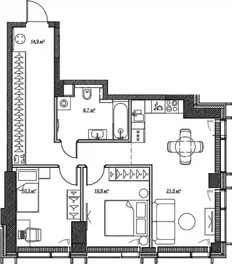 Планировочные решения включают как классические форматы, так и европланировки. Квартиры сдаются без отделки, с потолками высотой 3,1 метра и увеличенной площадью остекления. В некоторых квартирах предусмотрены просторные террасы.