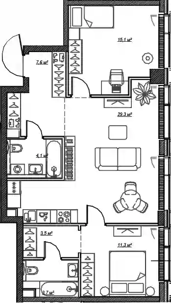 В комплексе предложен широкий выбор планировочных решений: от компактных студий площадью 22 кв. метра до просторных резиденций площадью 120 кв. метров. Планировками предусмотрены мастер-спальни с гардеробной и санузлом, просторные кухни-гостиные, гардеробные и системы хранения, выделенные рабочие зоны в спальнях и террасы с панорамным видом на город. Во всех квартирах панорамные окна и высокие потолки от 2,85 метра. Квартиры сдаются с отделкой White box.