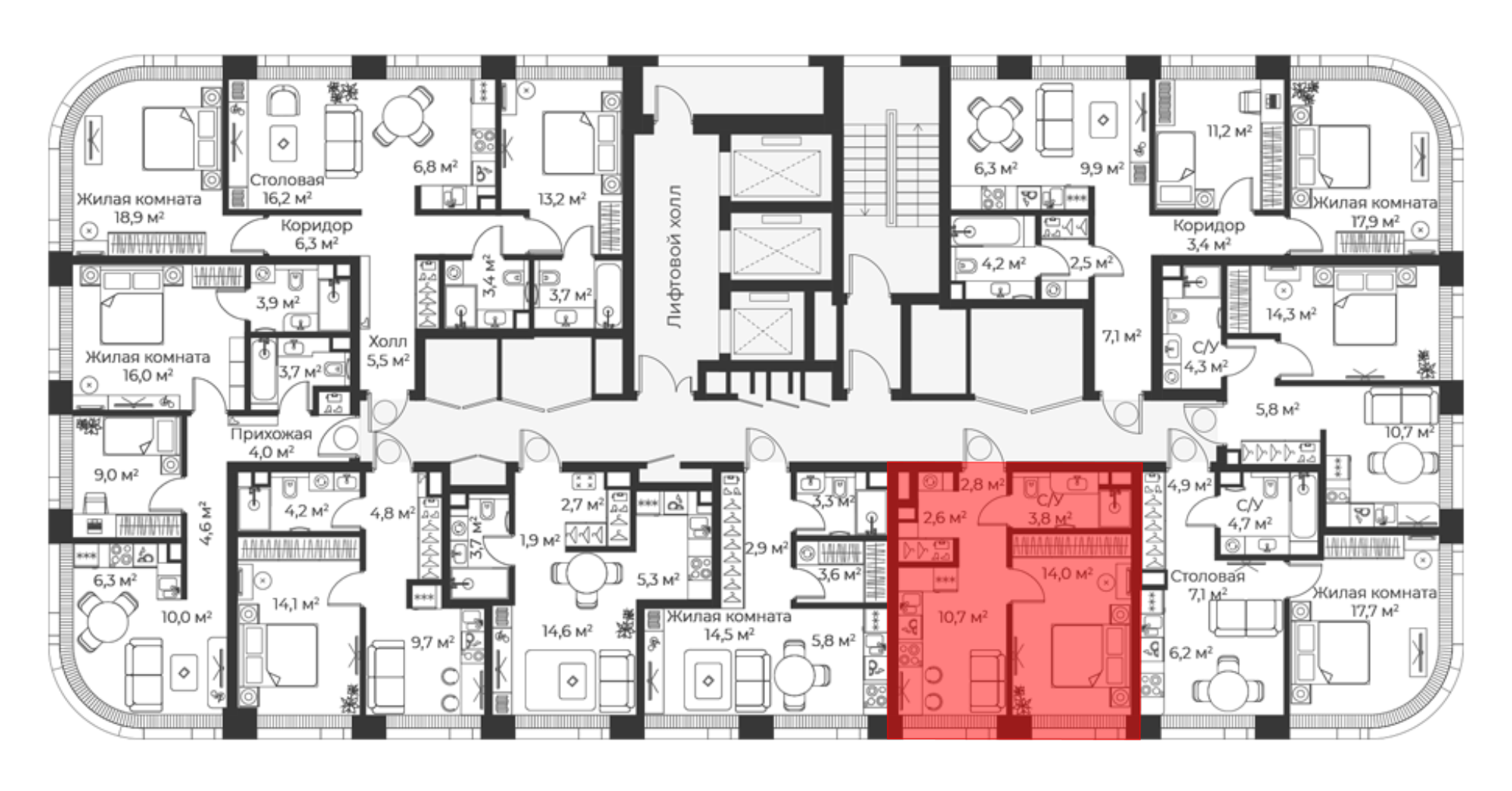 Планировочные решения включают как классические форматы, так и европланировки. Квартиры сдаются без отделки, с потолками высотой 3,1 метра и увеличенной площадью остекления. В некоторых квартирах предусмотрены просторные террасы.