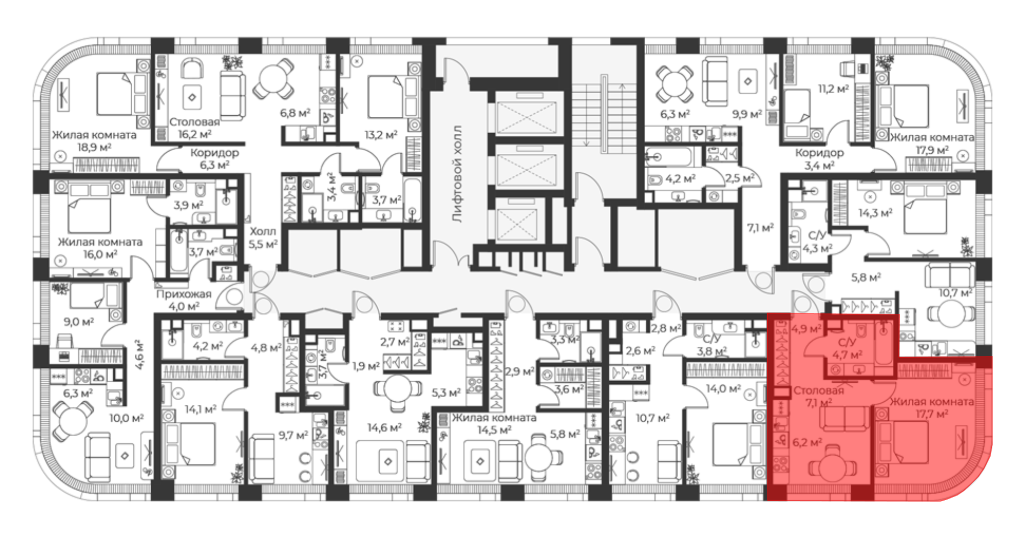 Планировочные решения включают как классические форматы, так и европланировки. Квартиры сдаются без отделки, с потолками высотой 3,1 метра и увеличенной площадью остекления. В некоторых квартирах предусмотрены просторные террасы.