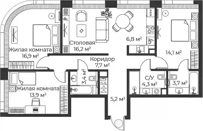 В комплексе предложено множество планировочных решений: в наличии квартиры, как классического типа, так и европланировки. Квартиры сдаются с подчистовой отделкой, высотой потолков 3 м и панорамным остеклением в пол.