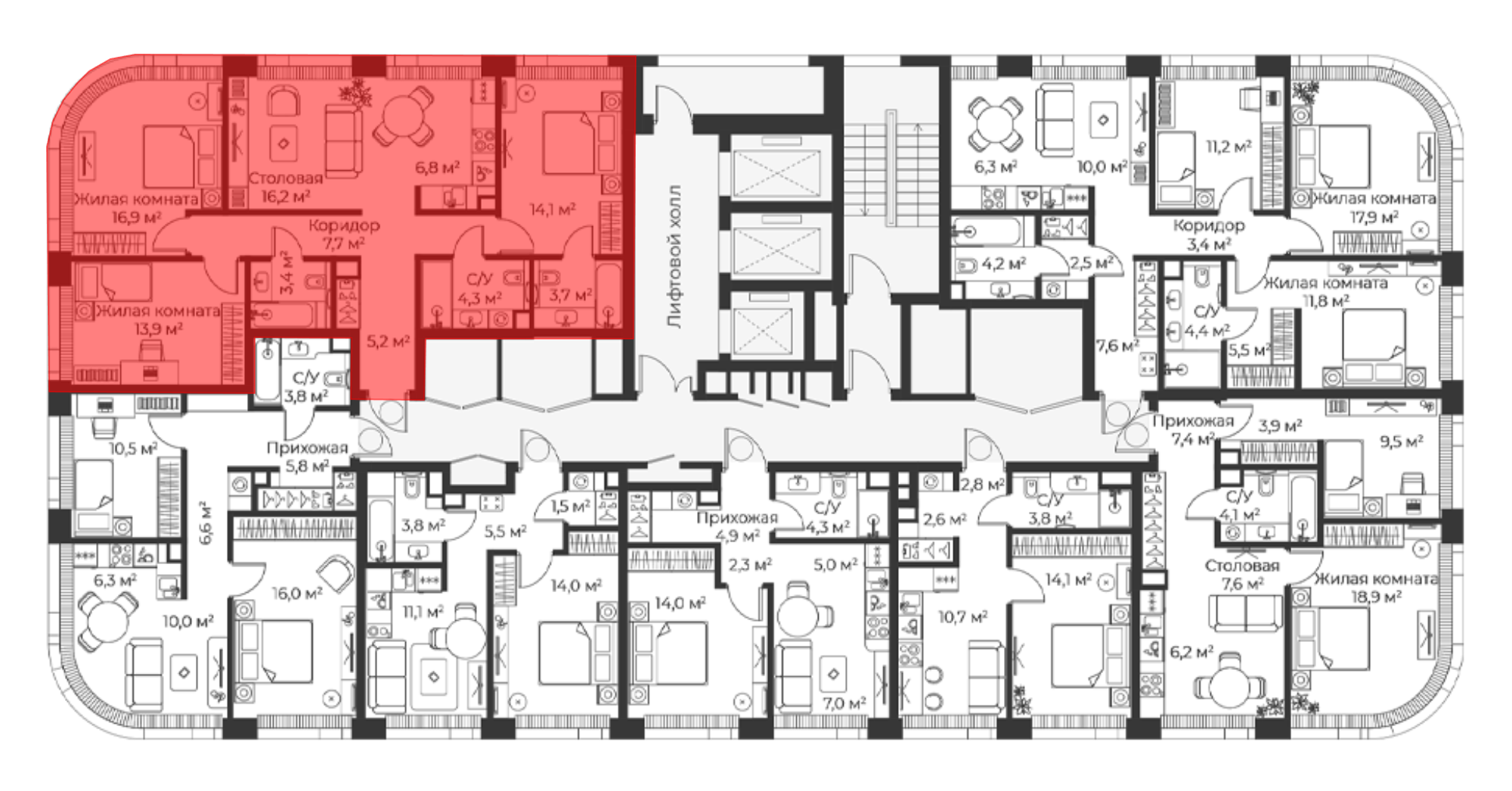 Планировочные решения включают как классические форматы, так и европланировки. Квартиры сдаются без отделки, с потолками высотой 3,1 метра и увеличенной площадью остекления. В некоторых квартирах предусмотрены просторные террасы.