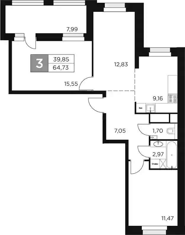 13 077 800 ₽3-к.квартира, 54.86 м², 15 эт.