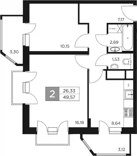 12 100 800 ₽2-к.квартира, 49.19 м², 6 эт.