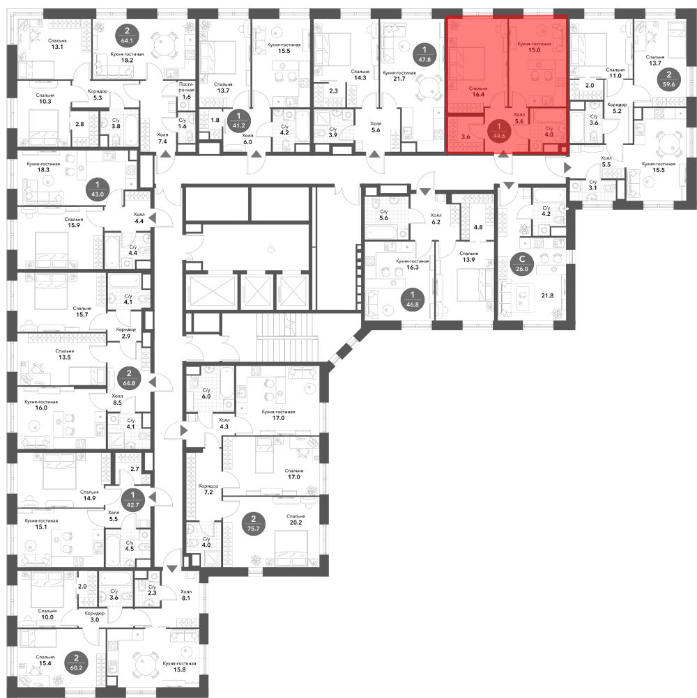 2-к.квартира, 44.6 м², 22 эт. в ЖК Voxhall Корпус 1