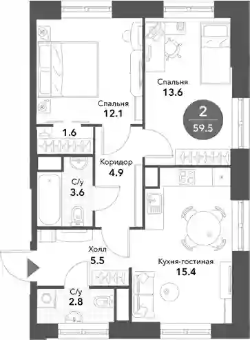 34 000 960 ₽3-к.квартира, 60.2 м², 2 эт.