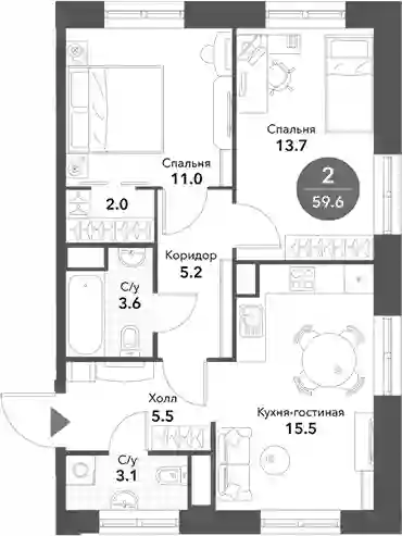 59.6 м2