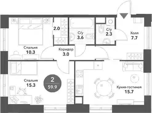 3-к.квартира, 59.9 м², 3 эт. в ЖК Voxhall Корпус 1