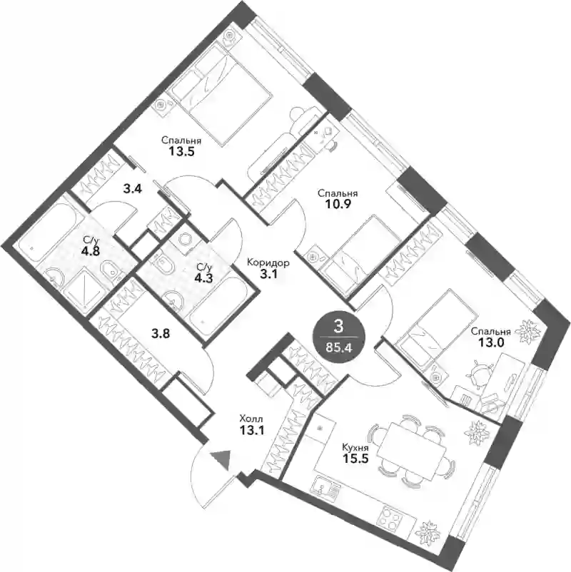 В проекте представлены квартиры с 1–4 спальнями в формате европланировок с панорамными окнами и потолками до 3,5 метров. Помещения идут без стен, что позволяет владельцам организовать пространство по собственному вкусу. Также доступны варианты с полной отделкой, включая дизайн-проект под ключ с мягкой мебелью или с кухней и встроенной бытовой техникой.