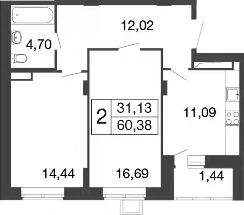 11 191 488 ₽2-к.квартира, 61.58 м², 4 эт.