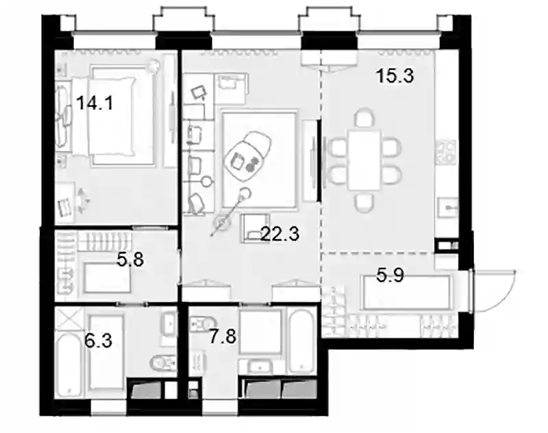 В проекте представлены квартиры с 1–3 комнатами, а также апартаменты, которые занимают 4–8 этажи. Планировки продуманы с учетом разных сценариев жизни, доступны евроформаты с объединенной кухней-гостиной. Все помещения имеют увеличенные окна, высота потолков достигает 3 м. Объекты передаются без внутренних перегородок.