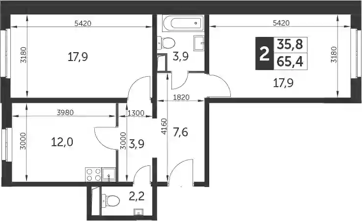 13 622 558 ₽2-к.квартира, 65.4 м², 3 эт.