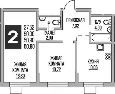 11 890 000 ₽2-к.квартира, 52.2 м², 1 эт.
