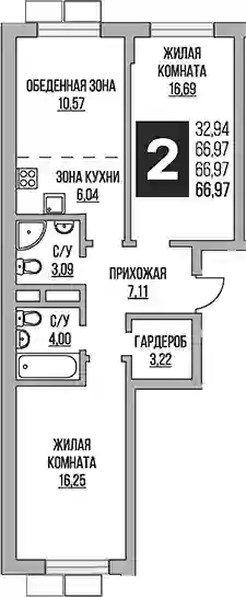 3-к.квартира, 66.97 м², 2 эт. в ЖК Живописный Корпус 1