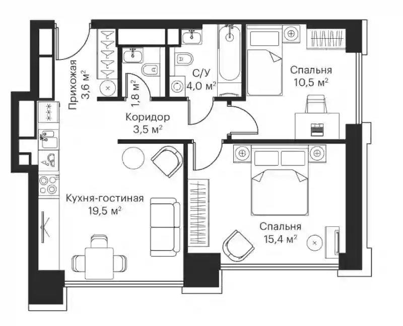 • Площадь кухни 19.5 м²