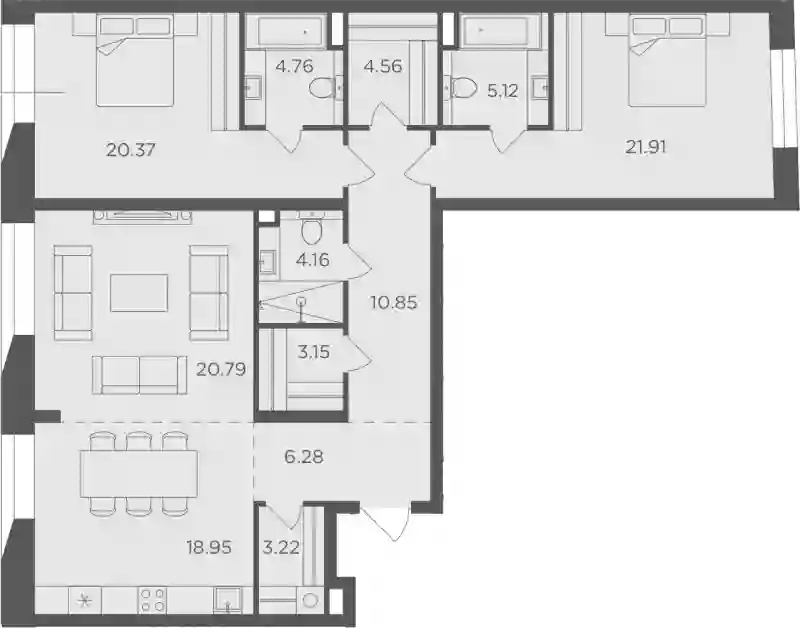 В комплексе предложен широкий выбор планировочных решений: от компактных студий площадью 22 кв. метра до просторных резиденций площадью 120 кв. метров. Планировками предусмотрены мастер-спальни с гардеробной и санузлом, просторные кухни-гостиные, гардеробные и системы хранения, выделенные рабочие зоны в спальнях и террасы с панорамным видом на город. Во всех квартирах панорамные окна и высокие потолки от 2,85 метра. Квартиры сдаются с отделкой White box.