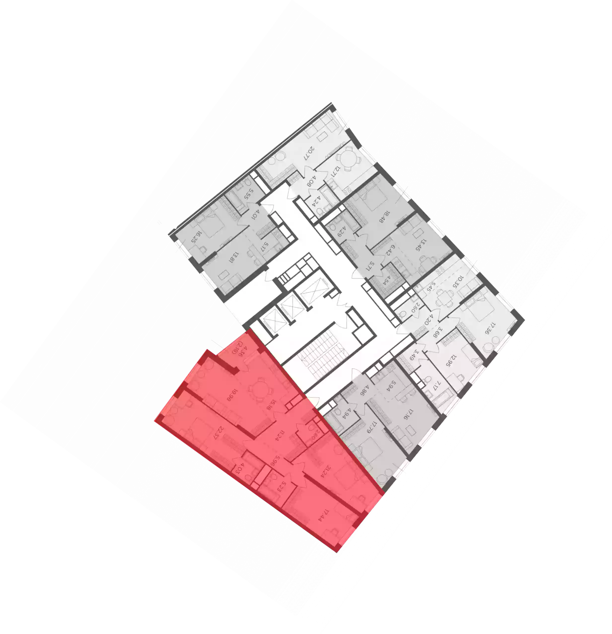 В жилом комплексе представлено 50 вариантов планировок квартир площадью от 28 до 110 кв. метров. Две трети из них оснащены балконом, лоджией или террасой. В проекте есть уникальные видовые квартиры с высокими потолками и панорамным обзором. Все квартиры сдаются с отделкой «white box».