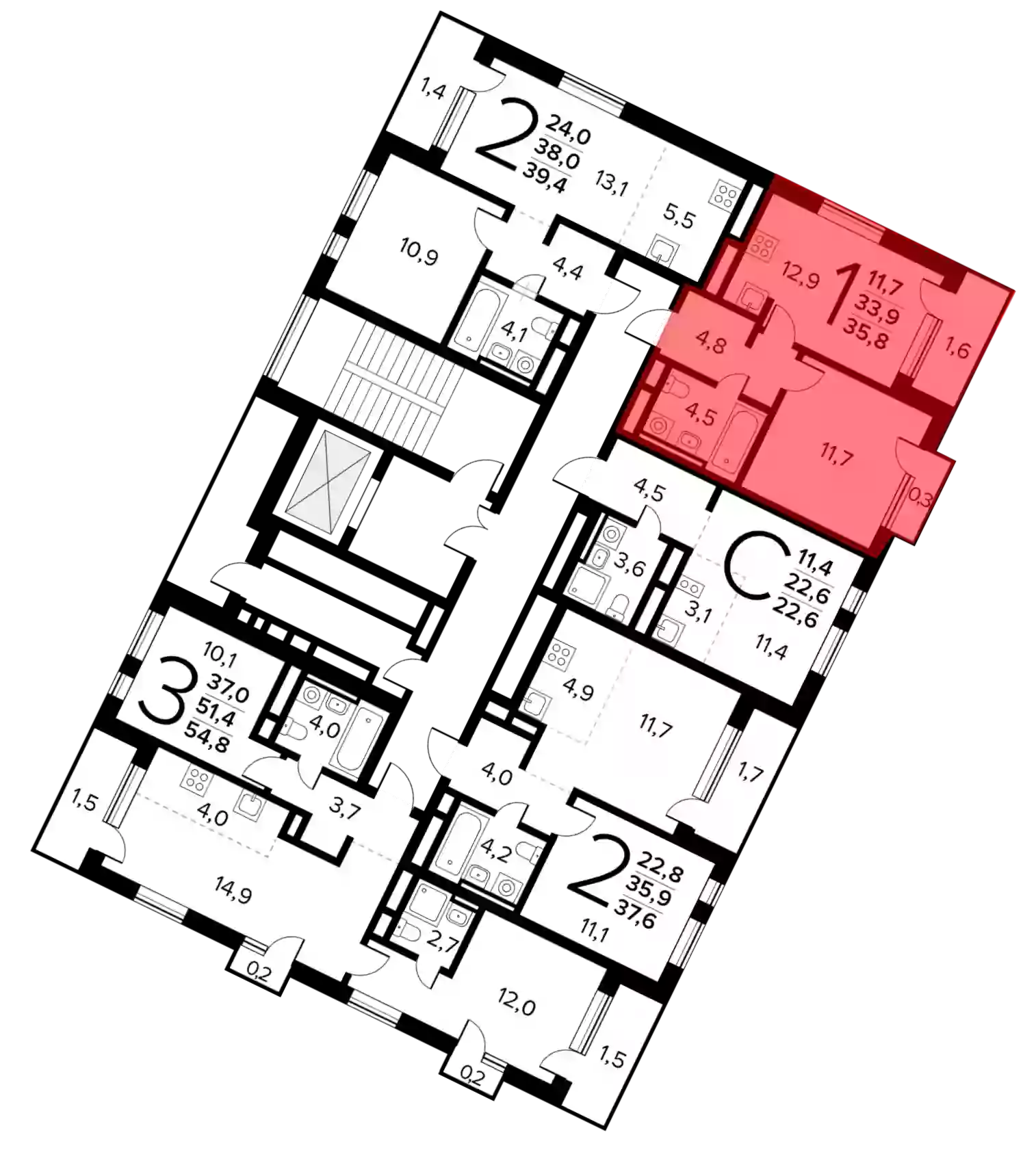- Общая площадь 33.9 м²