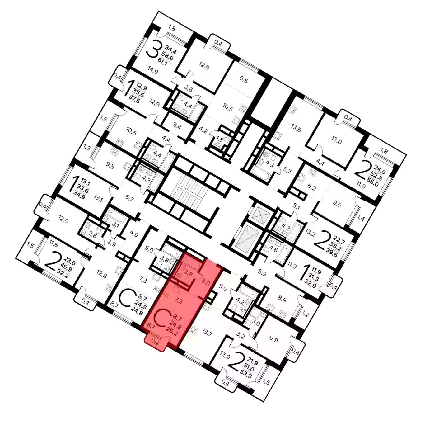 - Общая площадь 24.8 м²